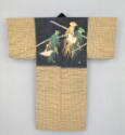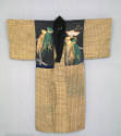 Label TextThe distinctive yellow plaid fabric was made in Hachijo Island, nearly two hundred miles south of Tokyo in the Pacific Ocean. The dark panels, more than 100 years older than the yellow fabric, were added to the kimono to create a strong contrast to the yellow. They were embroidered with cranes and bundles of rice. This kimono was perhaps worn for dance.