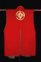 Label TextThis brilliant red vest, which would have been worn over a warrior’s armor, documents the movement of textiles across borders. The incorporation of wool, a foreign fabric imported from the West, signaled the status of the wearer, made all the more prominent by the large crest embroidered in gold on the back.