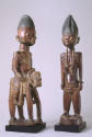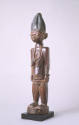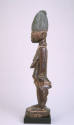 Label TextAn unusual relationship exists between this warrior and a female sculpture in the museum's collection. Clues to their identities must be read in a Yoruba context. A long braid of hair (asiso) emerges from the top of his head and serves as an indication that he has been prepared for war. Asiso are grown to cover incisions made to receive vaccinations that are applied to render warriors fearless. She has a snake around her neck like a chain--indicating her role as a verbal artist. Chanters perform for mortals, especially warriors and hunters, but ultimately chant for Ogun, the god of war and iron.