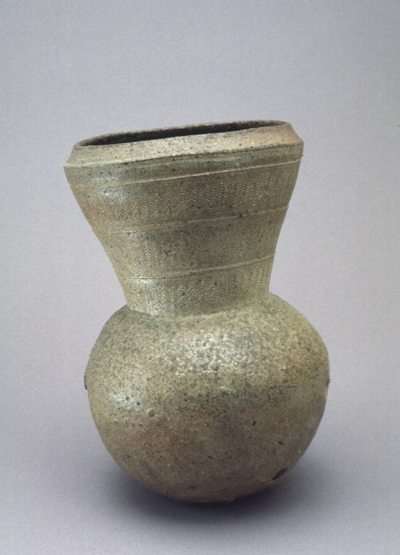 Label TextWheel-thrown, high-fired, gray-colored wares like this are called Sue-ki, or "Sue vessels," in Japan, where they were made from around 400 to the middle of the classical Heian period (794–1185). In both form and surface decoration, this long-necked ceremonial jar draws upon earlier Korean examples. In fact, Korean potters are credited with creating the first pottery of this type in the Japanese archipelago. The jar features three bands of carved, wave-like patterns around its neck and a significant covering of glossy green ash glaze on the mouth and shoulders.