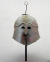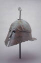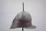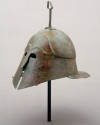 Label TextThis type of helmet covered the wearer's face except for his eyes, offering both protection and a menacing aspect to intimidate opponents. The spike may have held a plume or crest. Soldiers also wore a breastplate, greaves to cover the shins, and carried a shield.