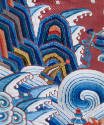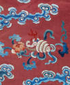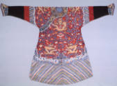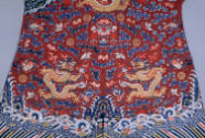 Label TextCourt attire was legislated by the Manchu rulers of China. Whether Han Chinese or Manchu, all donned Manchu-style clothing. This man’s garment uses standard motifs for a semiformal coat worn during official court functions, such as the five-claw dragon motif and the lishui (standing water) diagonal stripes above the hem. The red color of the silk and double-happiness characters amid a design of cranes, bats, and fungus wish the wearer a felicitous marriage, long life, and good fortune.
