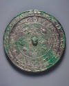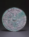 Label TextThe traditional medium of bronze continued to be used for making mirrors. The miniature mirror (45.34) still retains much of its original luster, attesting to the superb craftsmanship. Foreign influence is apparent on another mirror (51.107) in its novel eight-lobed shape, which was based on a botanical form. The marriage mirror 45.32) would be used in the wedding ceremony as a protective charm for conjugal happiness, as symbolized by the auspicious animals and plants, some shown in pairs or entwined. The motif in the center of the marriage mirror is a diagrammatical representation of the Five Sacred Mountains, with the knob appearing as the central mountain. Auspicious clouds, alternating with four more good omens, rise above them.