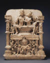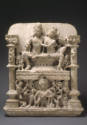 Shiva and Parvati, each bedecked with jewels and nimbus, sit in royal ease on top of Mount Kailasa. The mountain throne of the gods is symbolized here by a circular, three-tiered platform decorated with tree motifs, serpents, a bird and an animal, all representing the flora and fauna of the mountain. Below is Ravana, an enemy of the gods who has been imprisoned in the netherworld by the weight of Shiva's mountain. In an effort to break free, Ravana shakes the mountain, causing a quake which alarms Parvati. Glancing downward, she turns to Shiva for reassurance while he calmly presses down with his foot to hold the mountain secure. The tranquility and harmony of the godly world prevail. The image's rectilinear shape and small size suggest that it was probably part of the wall decoration of a Hindu temple dedicated to Shiva.