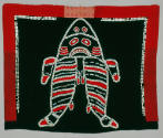 Label TextThe dogfish shark is a Haida crest and appears on many art forms associated with family oral traditions like totem poles, woven hats and clothing. Using pearl buttons, abalone shell pieces and red cloth, the designer of this robe creatively depicts the head of the creature as if seen from beneath, accentuating its large eyes, downturned mouth and gill slits. The shark's body is presented splayed open, stylizing its internal anatomy, its prominent dorsal fin, pairs of pectoral fins and its powerful, asymmetrical tail.