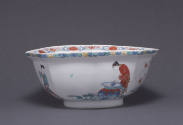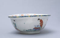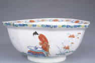 Label TextA boy emerging from a large ceramic jar is the central theme of a popular Japanese Kakiemon scene copied at Meissen and Chelsea. The intermingling of East and West is visible in the Japanese Kakiemon form, motif, and palette of this European porcelain bowl, which illustrates a Chinese folktale.