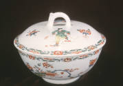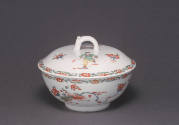 Label TextThe Bow Porcelain Manufactory of New Canton was the official early name of the English factory that produced this bowl. It heralds the factory's goal to compete with and even undercut Asian imports. The Japanese banded hedge pattern, a prunus tree, a "Chinese boy" playing with a string to which an enormous flower is attached, and a mythical lion (shishi) make up the pastiche of Asian-inspired motifs on this bowl and cover. This is a rare Bow pattern.