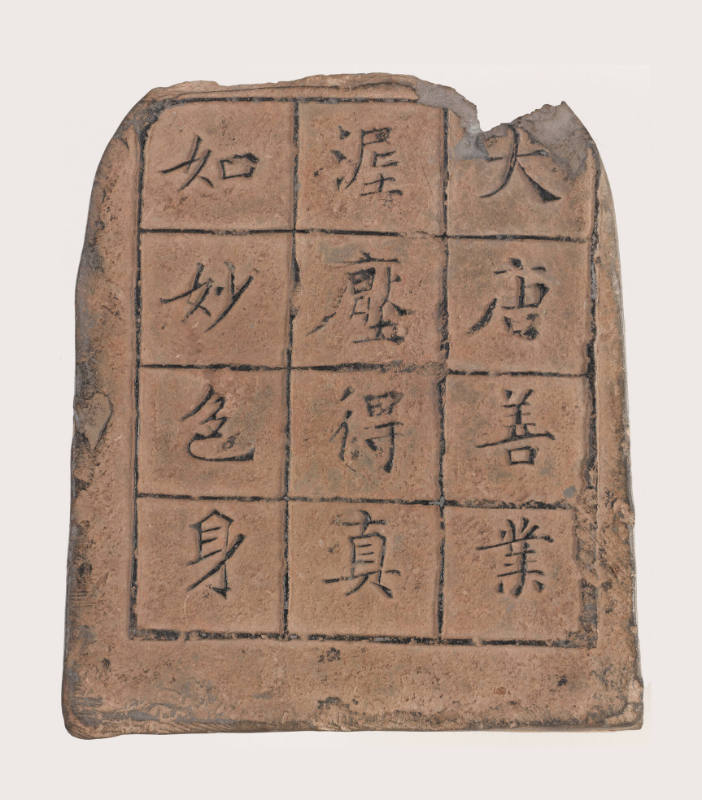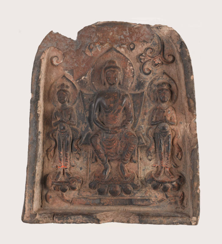 Label TextMaitreya Buddha holds the meditation gesture, with hands resting in the lap. Words on the tablet’s other side describe the Buddha’s transcendent nature being manifest in his physical form: “For good karma during the Great Tang dynasty, this clay is impressed with the Buddha’s marvelous form body that captures his true thusness.” This tablet was impressed using a mold, and some red pigment remains from its ritual consecration. By donating the means to have it made, a person accumulated karmic merit for themselves or for others.