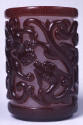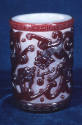 Label TextWhile the production of glass has often been compared to that of ceramics, Chinese glassmakers during the Qing period spent considerable effort in carving, as seen in the red dragons on this brushholder. The frosted white ground recalls translucent white jade, and may have anticipated the development of "Peking glass," which can easily be mistaken for jade.
