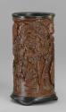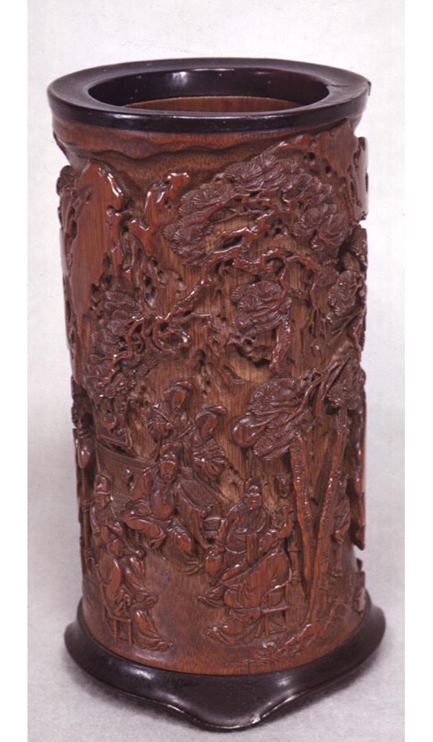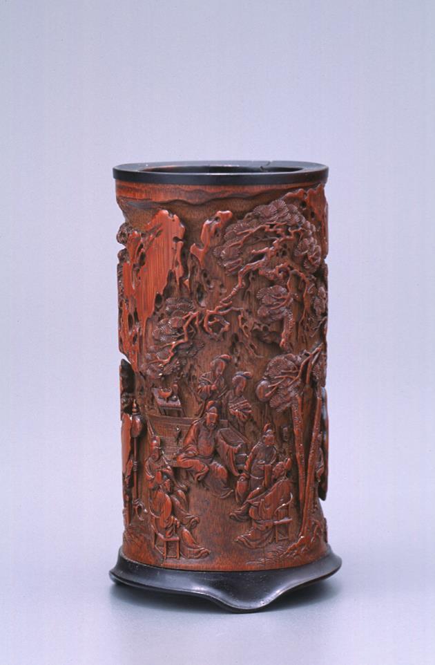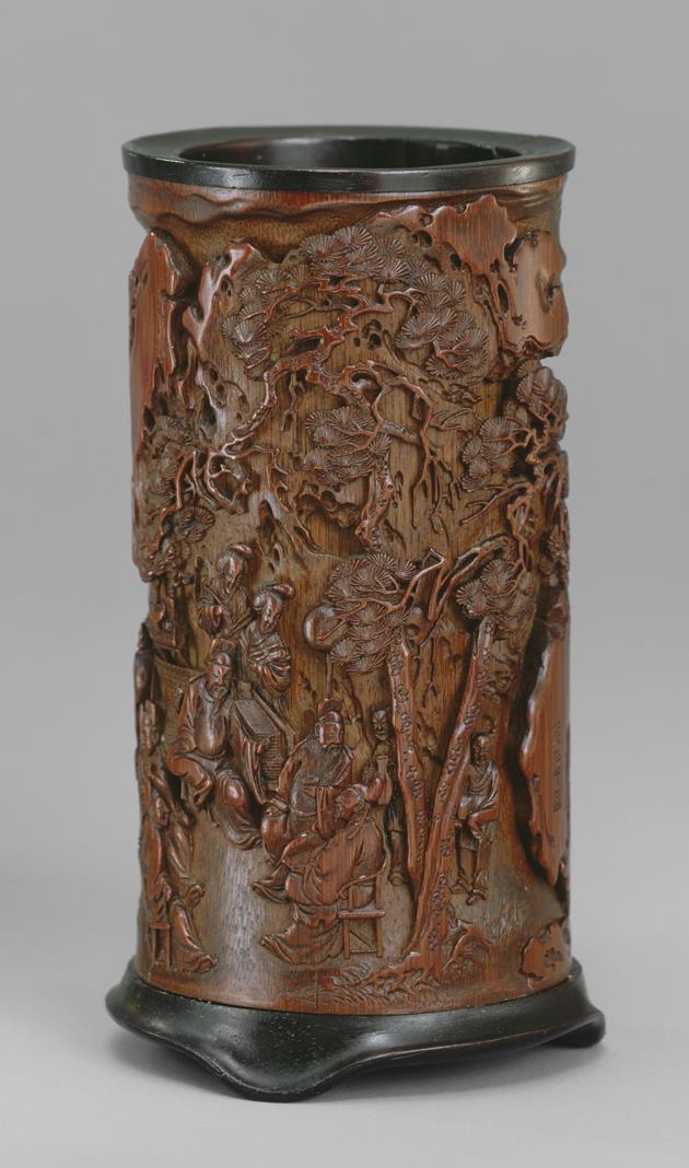 The brush pot’s utilitarian purpose does not preclude it from being very finely made. Antiques and fine ceramics surround a gentleman seated on a kang couch, with books stacked to his left and an ancient bronze jue—a tripod wine cup—at right. His friends sit on “official’s hat” chairs, like the ones in this gallery. Skillfully rendered details show identifiable types like the bronze ding food vessel on the display table, and a Longquan celadon “hundred rib” jar with lotus cover, on the opposite side. Gu Jue, known for his meticulous and complex compositions, served at the Emperor Kangxi’s court.