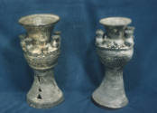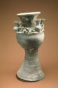 Label TextRitual vessels with small cups and sometimes clay figures (humans and animals) began to be made in Japan in the 500s. These vessels reflect new funeral and burial practices introduced from China via the Korean peninsula. This example may depict a hunting scene.