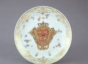 Label TextThe decoration on this service combines the armorial shield of the Elector of Saxony and King of Poland with Japanese-style flowers and bound sheaves of grain. This plate was part of a royal Saxon commission to the Meissen factory for court use.