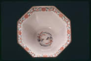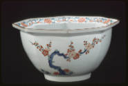 Label TextArtfully placed motifs of plum, pine and bamboo decorate the exterior of this faceted bowl, while a pair of phoenixes chase one another around the center of the bowl's interior. Typical of Kakiemon-style Imari ware, much of the object's milky-white surface is left unembellished, in stark contrast to neighboring pair of Imari vases.