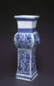 Label TextIn the late Ming period, novel shapes and ornament emerged in porcelain, recalling ancient bronzes of the late Shang to early Zhou period (12th - 10th century B.C.) - yet the exuberant overall patterning of this vase is unmistakably 16th century. The blue color also has a purplish tone because of the high-manganese cobalt, mined from Yunnan province in southern China.