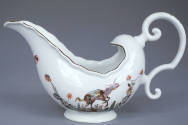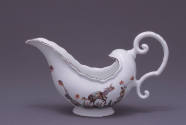 Label TextThis sauceboat is painted with fantastic imaginary animals in a style attributed to the Meissen painter Adam Friedrich von Löwenfinck. Several services with weird, splotchy-coated, heraldic-seeming animals strolling through flower-bedecked landscapes were produced between 1735 and 1740. The shape, scalloped edge, and scrolled handle of this sauceboat appeared in both porcelain and silver at this time.