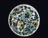Label TextThis unusual dish bears intricate decorations. Before firing, a detailed design of two dragons chasing a flaming pearl was incised into air-hardened clay on both the interior and exterior. After pre-firing, famille verte enamels were then applied on the biscuit body to paint tangerines and pomegranates—auspicious symbols of wishes for many offspring. The enamels may seem to obscure the pattern beneath, but the white space between the fruits gives the textured edges of the dragon scales an iridescent gleam.