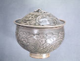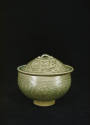 Label TextPeony blossoms are boldly carved on the sides and top of this covered bowl. The transparent olive green glaze, which characterizes Yaozhou ware as the northern celadon, has pooled in the recessed areas and pulled away from the areas in relief. The contrast lends depth to the surface decoration.