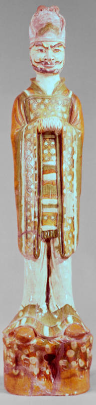 Label TextThis guardian wears a courtly hat and clothing with stamped designs. His hands are formally folded together underneath his robes like a civil official, and his moustache and beard suggest foreign origins. Given the regulations regarding the size and numbers of burial figures, this large piece was likely part of a set made for an elaborate aristocratic burial.