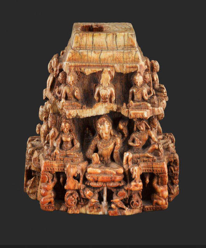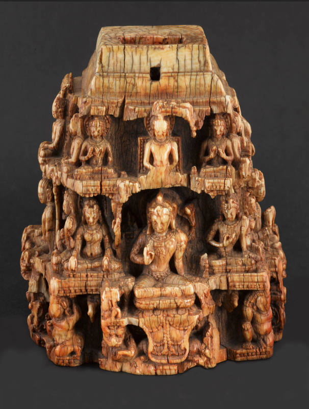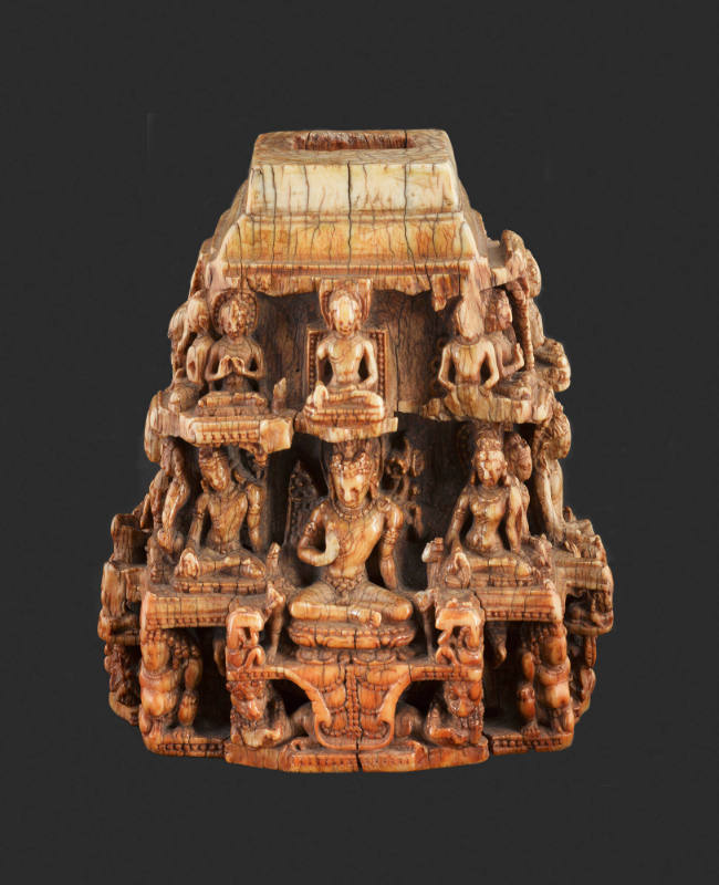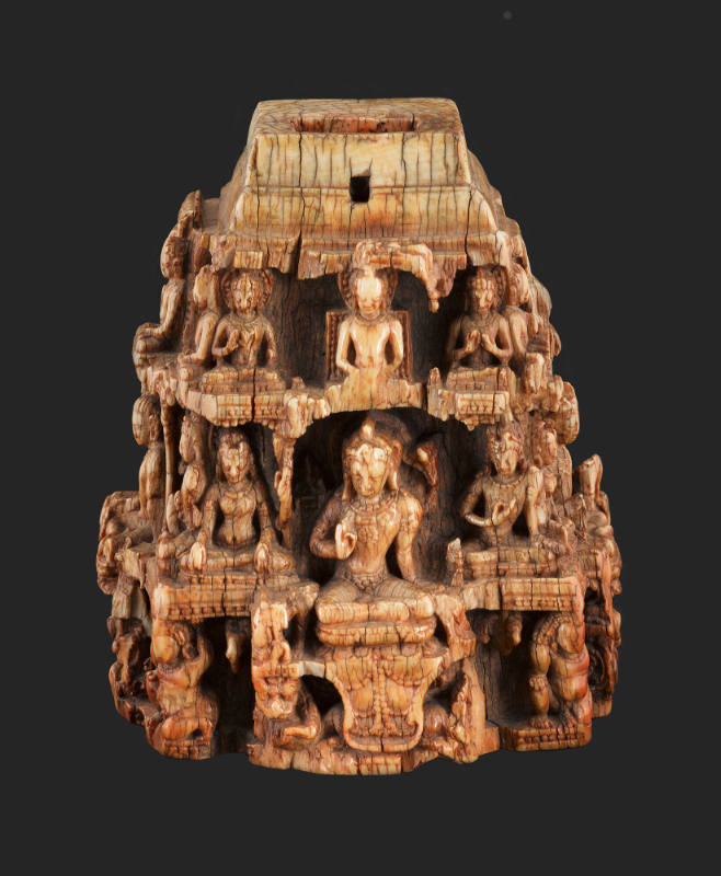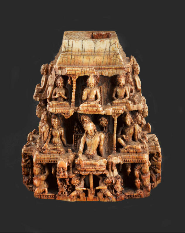 Label TextThis delicate architectural model acted as a three-dimensional diagram of the Buddhist cosmos. On the four sides sit large opposed bodhisattvas, each flanked by a male and female attendant. Above their heads rest twelve Buddhas in differing postures. The repetition and hierarchy of images reflect a moment when the evolving form of eastern Indian Buddhism was developing greater complexity in its rituals. This eventually transformed into the strictly ordered systems familiar in the Himalayan region today. Exactly what fit into the hole to crown this rare piece remains a mystery.
