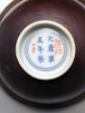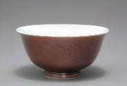Label TextThe yellow wares, as well as the aubergine bowl (44.143), require a second firing at a lower tem- perature to fuse the enamels to the transparent porcelain glaze beneath. They distinctly reflect the imperial taste for exquisite design and potting. The bowl's white interior-yellow exterior design indicates its use by a first-rank concubine as specified in the Regulations of the Palace of the Qing dynasty. The dragon-and-phoenix incised on the aubergine bowl is a decorative subject for imperial marriages.