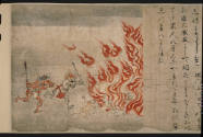 Label TextThis segment is a part of a longer handscroll that visualizes the various hells described in the Butsumyokyo sutra (Sutra on Buddhas’ Names). The calligraphy on the right describes one of these called the Shrieking Sound Hell. The image on the left illustrates the horrific scene. Two horse-headed demons are chasing naked monks who committed sins, such as beating and torturing beasts. The monks scream as fierce flames engulf them.