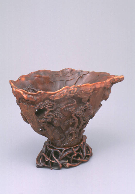 Rhinoceros horn was prized both for its rarity and for the special powers it was believed to possess for nurturing health as well as the mind. Exquisite drinking cups made of horns were often decorated with auspicious motifs, typically representing longevity. This one has an elaborate landscape scene, complete with rushing streams, a pine forest, and an oxen-riding traveler.
