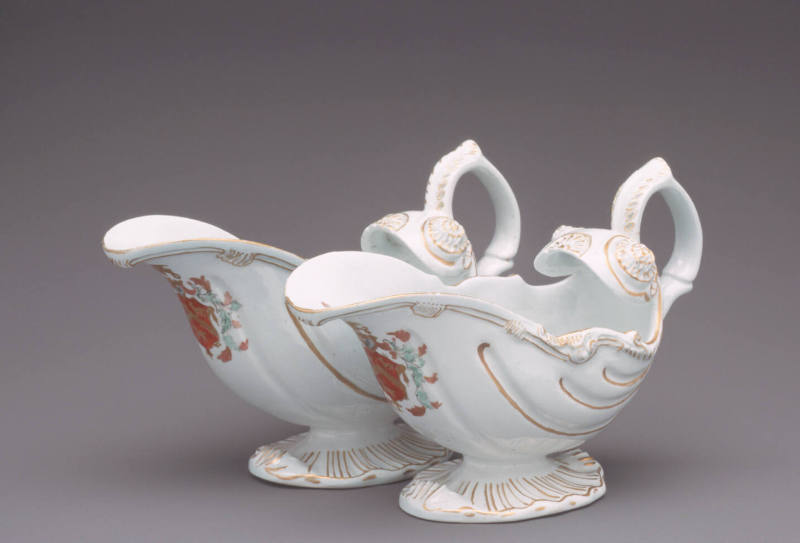 Painted with the Hynde coat of arms. The elegant molded porcelain shell perched on a base of gentle waves is from a silver shape of the period. Rococo designs for molded and slip-cast porcelain and for cast silver were especially interactive.