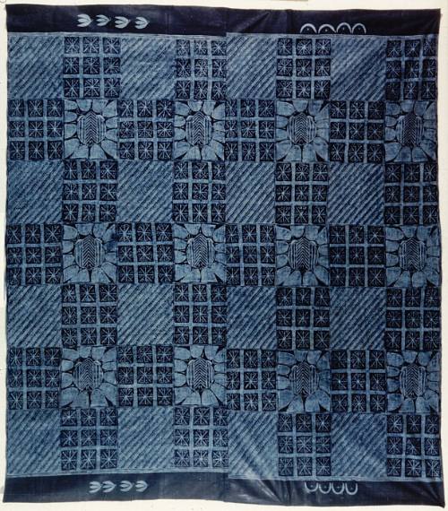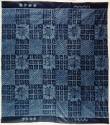 Label TextIndigo is a natural dye that sometimes suggests the hues of a midnight sky, shadows of dusk and dawn, as well as a melancholy mood. In Nigeria, plain cotton shirting began arriving from England in the early 20th century. It was disregarded until indigo dyers began making the cotton into canvases by using feathers or stencils with cassava paste. In order to achieve the deepest blue-black, the cloth would be dipped repeatedly in a dye vat. One cloth quotes from the proverb, Atari Ajanaku Kinse Eru Omode:"The head of an elephant is no load for a child."