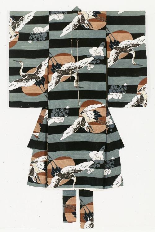 Label TextThis kimono made for a boy features a highly auspicious motif of cranes and the rising sun, associated with good fortune and longevity, making it appropriate for celebrations of the new year.