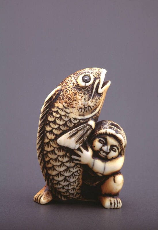 Netsuke modelled as Kintaro with a carp