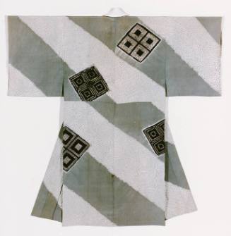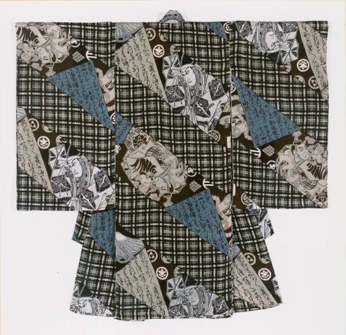 Label TextCrisp diagonals cover this kimono, but allow glimpses of virtual patchwork. Stencils are used with exact alignment to give the impression of diagonal patches. Designs taken from ukiyo-e woodblock prints are referenced and accented by deep triangles of color.