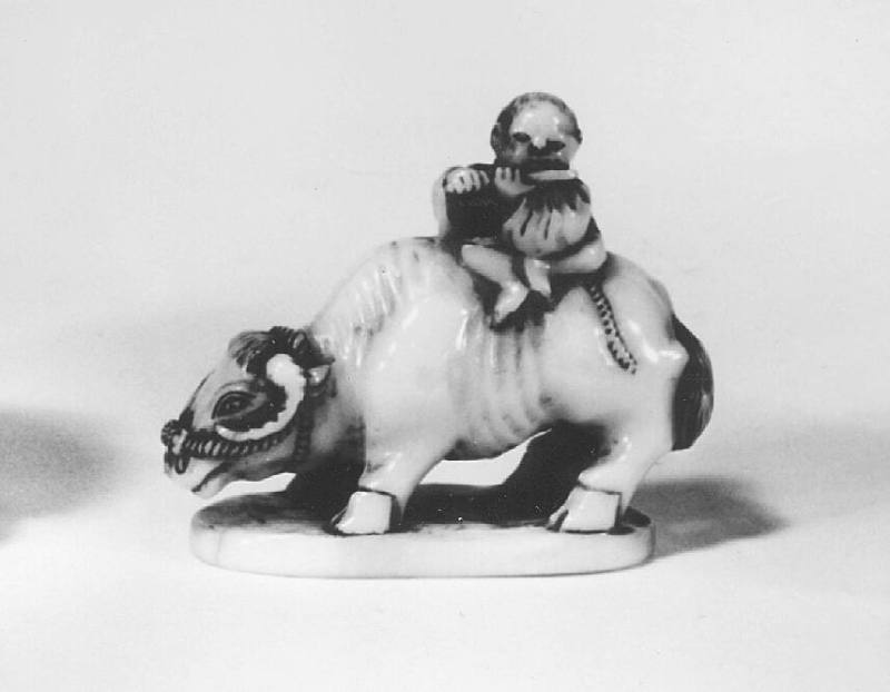 Netsuke modelled as a boy playing a flute astride a water buffalo