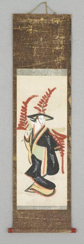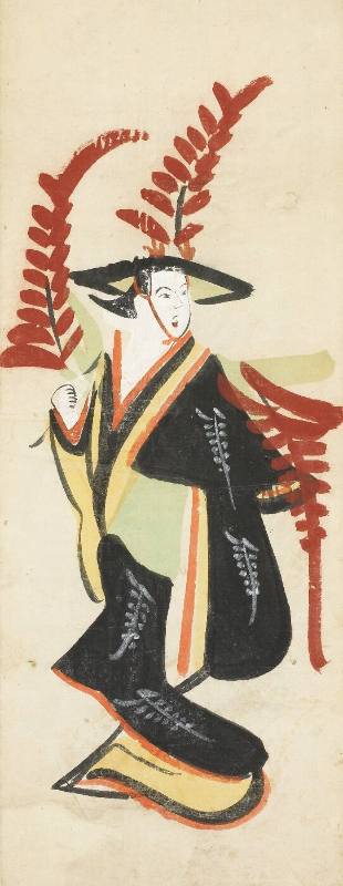 Otsu-e got their name from the town of Otsu, a popular destination for pilgrims in the 17th–­19th centuries. As souvenirs for travelers, Otsu-e paintings were made to be inexpensive, simple, and easily reproducible, characteristics that are at the core of Yanagi’s criterion of beauty. This example shows Wisteria girl (an ideal beauty), a recognizable figure that was commonly depicted in Otsu-e. This genre of painting commonly expressed good morals and duties but was sometimes also seen as satirically parodying the elite.