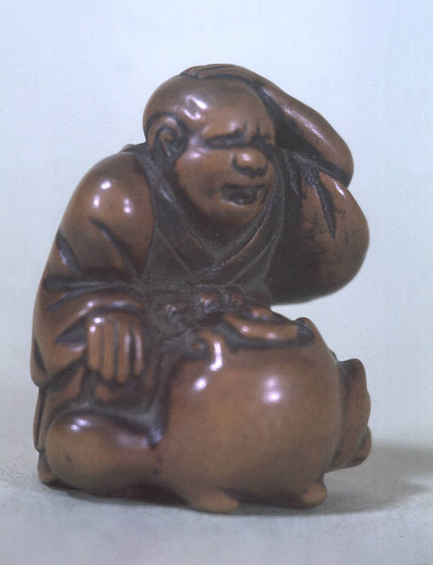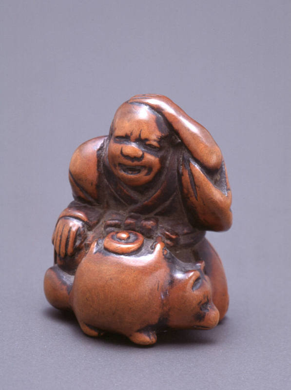 Netsuke modelled as Priest and Badger teapot (bunbuku chaga)