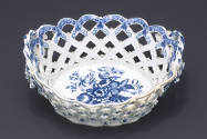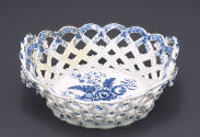 Label TextThe center of this basket is transfer-printed with the Pine Cone pattern. Transfer-printing was an innovative British decorative technique that put the livelihood of porcelain painters in jeopardy. Using a printing process that involved engraved copper plates, enamel color, and paper, a design could be transferred from a copper engraving to multiple ceramic bodies in less time than it took to hand-paint the decoration.