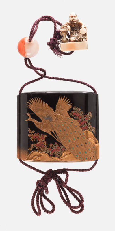 Inro decorated with peacock, ojime, and netsuke
