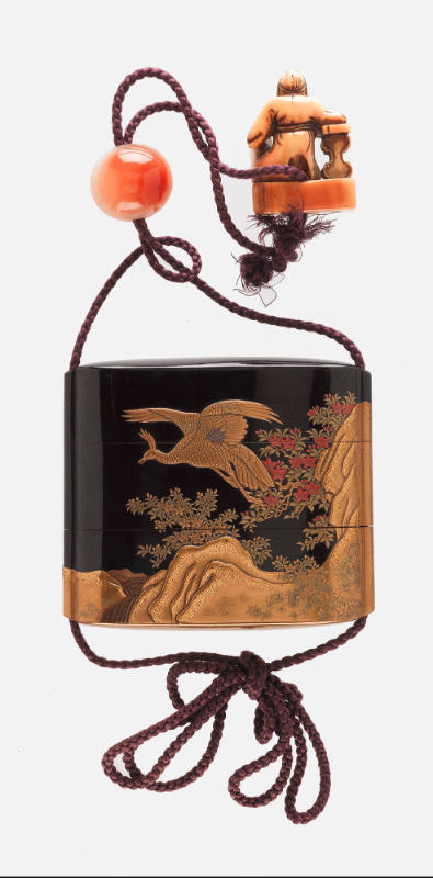 Label TextInro are containers for small personal items such as seals and herbal medicines. Japanese men of the Edo period (1603–1868) wore them hanging on the obi (sash) of their kimono. The small bead called ojime tightens the inro’s cord. Netsuke, intricately carved toggles, were attached at the end of the cord to prevent the inro from slipping through the obi. By the eighteenth century, both inro and netsuke had become more elaborate and decorative and were commissioned by merchants, samurai, and others who could afford them.