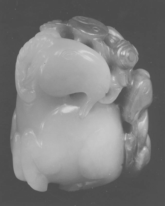Label TextThis small ornament in the form of three rams exemplifies the obscure origins of many auspicious motifs in Chinese art. Rams, goats and sheep are all called yang in Chinese, which is a homophone for the positive male force, yang, the opposite of yin. The three male lines correspond to heaven, and above them are three female lines, symbolizing earth.