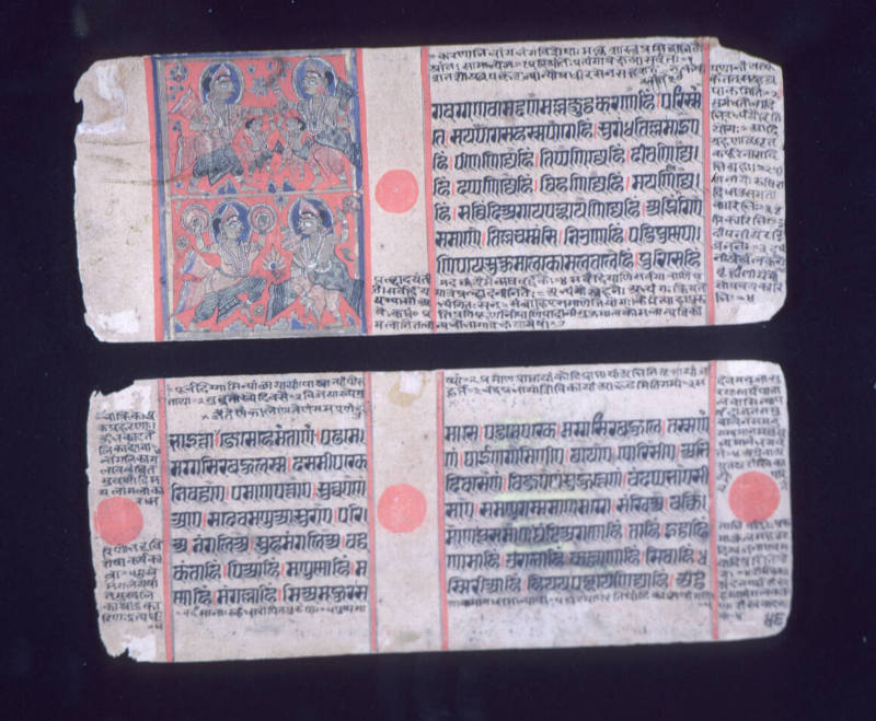 The Kalpasutra, one of the fundamental texts of Jainism, narrates the life of Mahavira (6th or 5th century BCE), last of the 24 jinas (conquerors). Through renunciation and nonviolence, the jinas perfected themselves and achieved moksha (release from the cycle of rebirth). Wealthy Jains often commissioned Kalpasutras illustrated with Mahavira’s key life scenes and donated them to monastic libraries. The horizontal orientation of the pages mimics early Indian books created on palm leaf, a format still used for many Jain, Buddhist, and Hindu scriptures.
