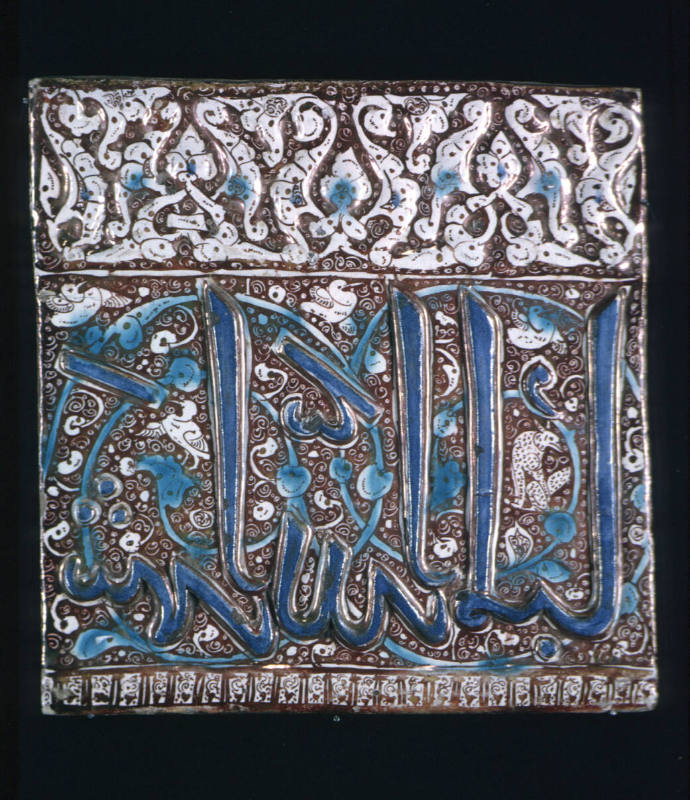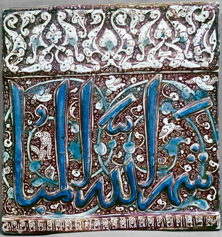Label TextThe graceful cobalt blue inscription, set against intricate metallic luster-glaze foliage on a white ground, formed part of a much longer inscription around a mihrab or in a shrine or palace. The writing references Ramadan, observed over the ninth month of the Muslim calendar. This holy period is a time of physical and spiritual purification, including fasting during daylight hours, praying and reading the Qur’an together at the mosque, and quiet contemplation.