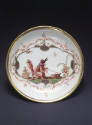 Label TextThis saucer is an excellent example of the fanciful, sometimes odd scenes depicted in chinoiserie. Here, an exotically robed gentleman in a feather-eared cap is attempting to drive a sta-tionary chair harnessed to two tortoises. A huge mosquito flies overhead.