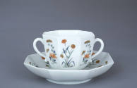 Label TextMeissen began copying Japanese Kakiemon wares in the mid-1720s when these wares were the height of fashion in Europe. This cup and saucer are marked with the factory's crossed swords in overglaze enamel, rather than the standard underglaze blue. Because the overglaze marks could be removed, these wares were almost certainly a part of an early fraudulent scheme to produce porcelains intended to be sold at a higher price as Japanese originals. The plan was uncovered and the perpetrators jailed or deported.