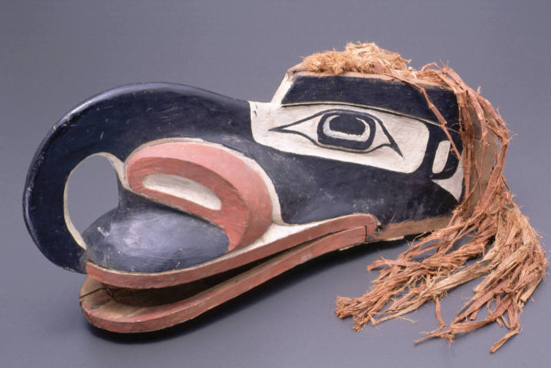 Label TextCrooked Beak, and his cohorts Huxwhukw and Man-eating Raven, command the dance floor when the wild hamat’sa dancer temporarily takes leave. Ironically, these fearsome birds participate in the ritual taming of the hamat’sa, who re-enters the dance floor wearing a cedar bark headdress and neck ring, symbolic of his ritual transformation.