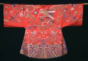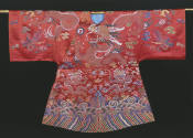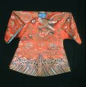 Label TextChinese attire can be distinguished in shape and construction from Manchu attire. This Chinese woman’s red bridal coat was originally worn with trousers. Its quasi-official decoration borrows themes from formal court garments where the imperial imagery of dragons in a cosmic landscape of stylized clouds, mountains, and ocean waves represent the wearer’s official rank and status. Specific wishes for continued success in officialdom include coral branches, which refers to coral hat finals worn by first-rank civil officers. The word for halberd (ji) is a pun for rank (ji), so the boats each carrying three halberds represent wishes for one’s sons to be quickly promoted many, many times.