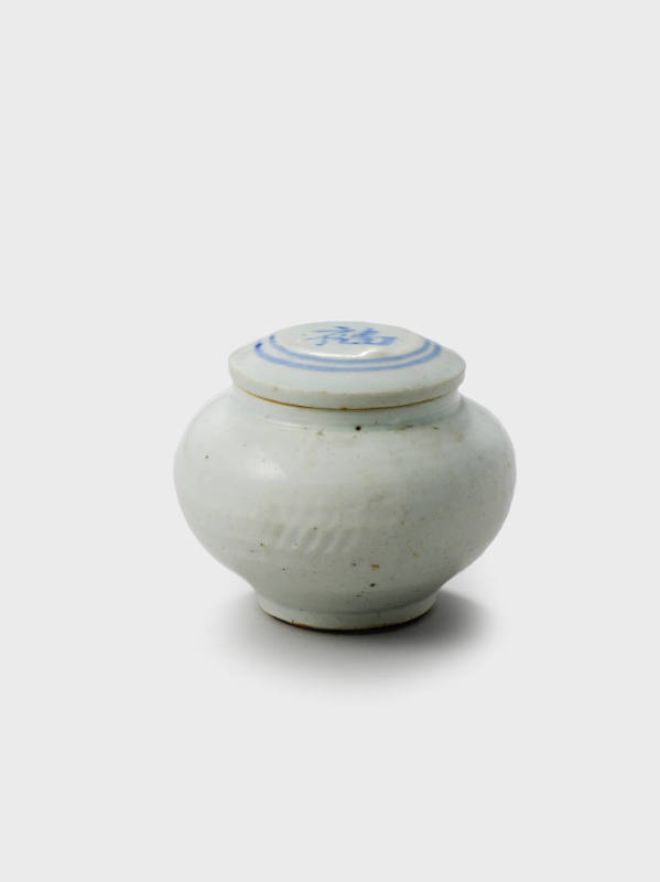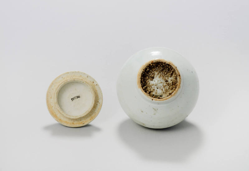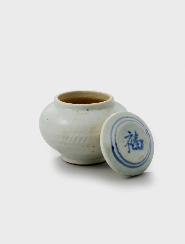 Label TextThe Chinese character painted in underglaze blue on the lid of this small jar means "good fortune" or "blessings." Korean objects, as well as their Chinese and Japanese counterparts, often employ Chinese characters as the sole decorative motif. A single character, such as (happiness, blessings) or (longevity), confers an auspicious meaning on an otherwise functional object.