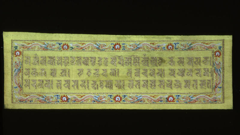 These yellow tapestry book covers are in Lantsha, a Tibetan script often used to transliterate Sanskrit.