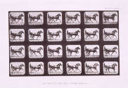 Label TextIn May 1872, Muybridge made his first photograph of a horse trotting on a racetrack in Sacramento, California. From 1884 to early 1886, he would take over 20,000 photographs documenting various stages of human and animal activity.
