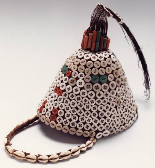 MediumRaffia, imported buttons, cowrie shells, fiber, elephant tail