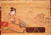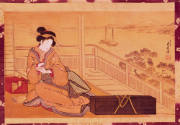 Label TextA courtesan is shown at repose in a room that opens to a balcony and view of the bay. She holds a blue-white porcelain cup, while resting a hand within the folds of her robe. A smoking set is placed at one side, the box containing her shamisen, a three-stringed instrument, at the other. Tobacco introduced from Portugal, and shamisen introduced from Okinawa, were both expensive and exotic items in in those days Japan, clearly hallmarks of a fashionable courtesan and her affected lifestyle. The painting's three-dimensional sense reveals the artist's adaptation of a western perspective combined with a traditional style of beauty.