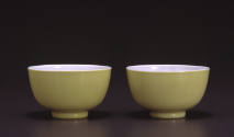 Label TextColored wares require a second firing at a lower temperature to fuse the enamels to the transparent porcelain glaze beneath. They distinctly reflect the imperial taste for exquisite design and potting. The combination of white interior and yellow exterior is a color code for wares made for the first-rank concubine, as specified in the Regulations of the Palace of the Qing Dynasty.